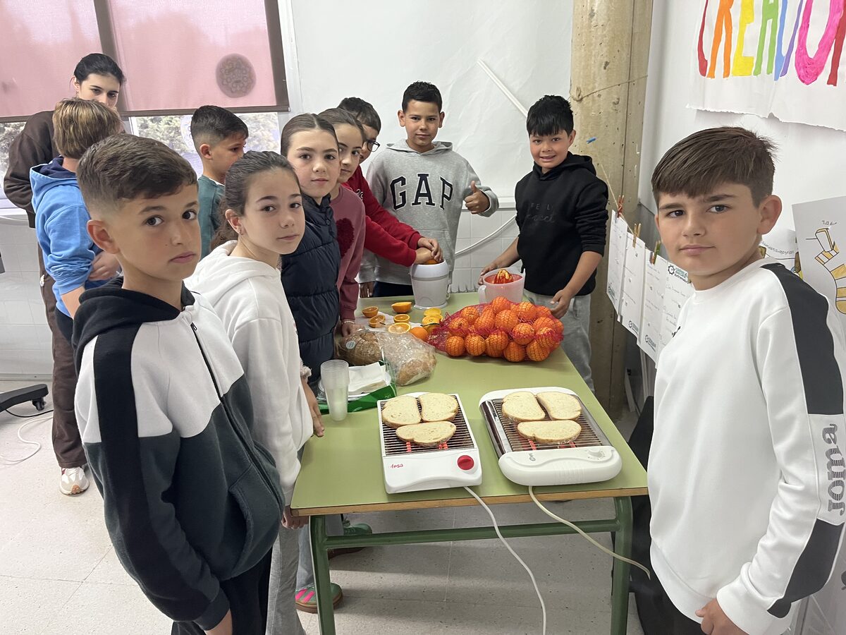 Todo el alumnado del Centro, con la ayuda de sus Maestros/as han elaborado y degustado un desayuno a base de tostadas con aceite, tomate, jamón, … y zumo de naranja recién exprimido